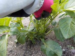 【芽かき】 土寄せの前に芽かきという作業を行います。 ジャガイモは、一つの種イモから5~6本の芽が出てきます。 すべての芽を成長させると、イモの数は多くなりますが、小さなイモになってしまいます。 そのため、太く丈夫な芽だけを3本ほど残して細い芽は抜いていきます。これを【芽かき】といいます。 |